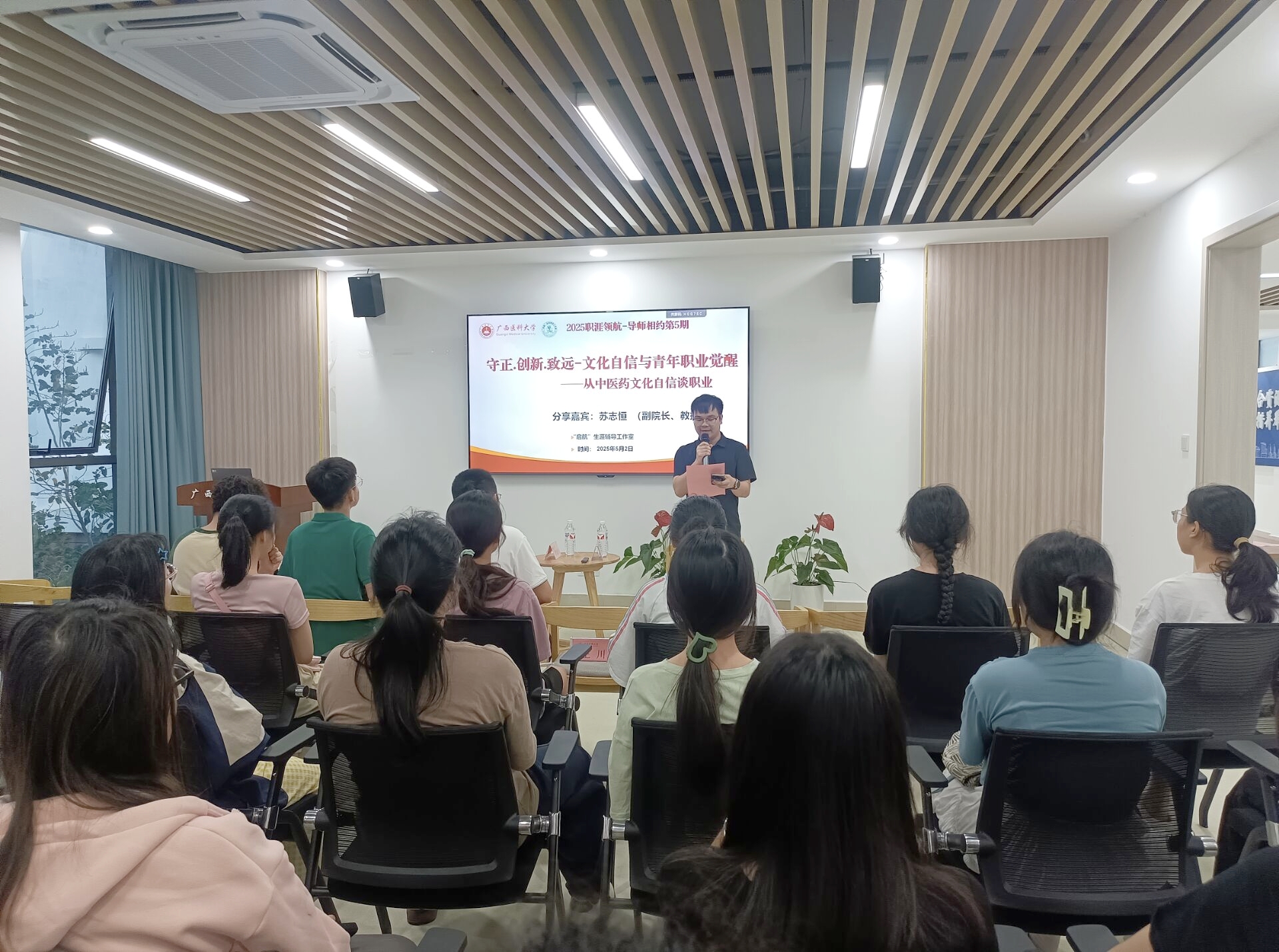 5月2日晚上,威尼斯人线上 在武鸣校区榕园学生社区三楼举办了“守正·创新·致远—文化自信与青年职业觉醒——从中医药文化自信谈职业”活动。活动邀请到了药威尼斯人线上 副院长苏志恒教授为本期活动的主讲嘉宾,学生工作部(处)、心理健康与咨询中心、体育与健康威尼斯人线上 以及各威尼斯人线上 师生参加本期活动。